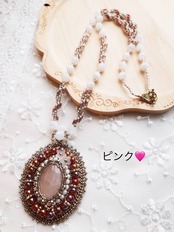 中央に配した大粒のローズクォーツ(天然石)を、一粒ずつ丁寧にビーズでフレーミングしていく贅沢なデザイン。繊細なビーズの重なりが、まるでアンティークジュエリーのような奥行きと気品を醸し出します。